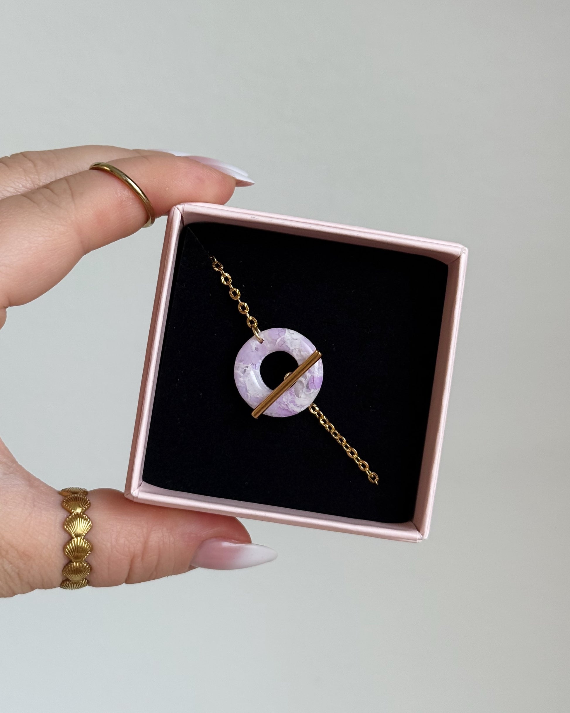 Kea on kauniin siro käsikoru, jonka kruunaa pyöreänmallinen, polymeerimassasta ja koruhartsista valmistettu rengasosa. Koru kiinnitetään salpalukolla rengasosan ympärille.