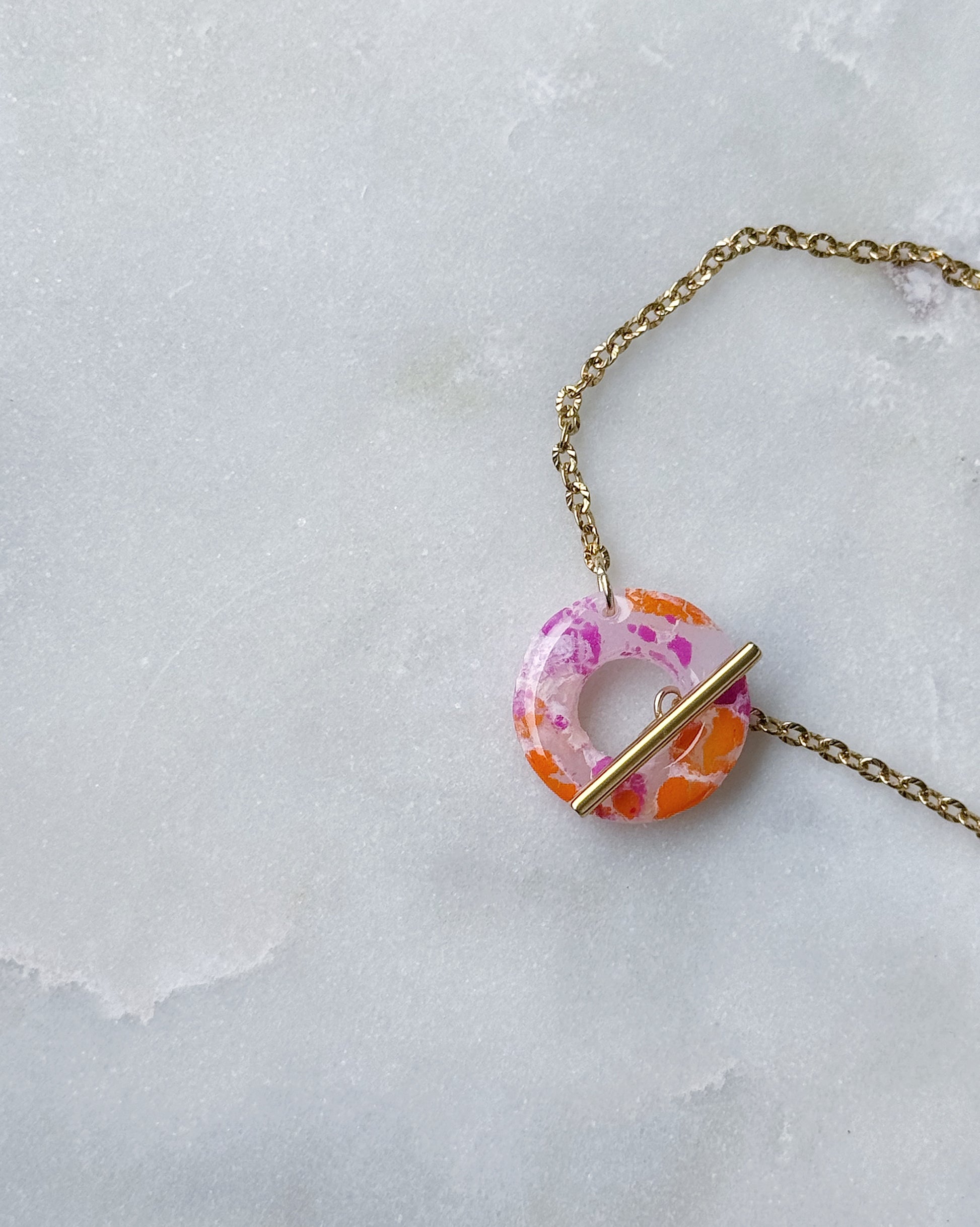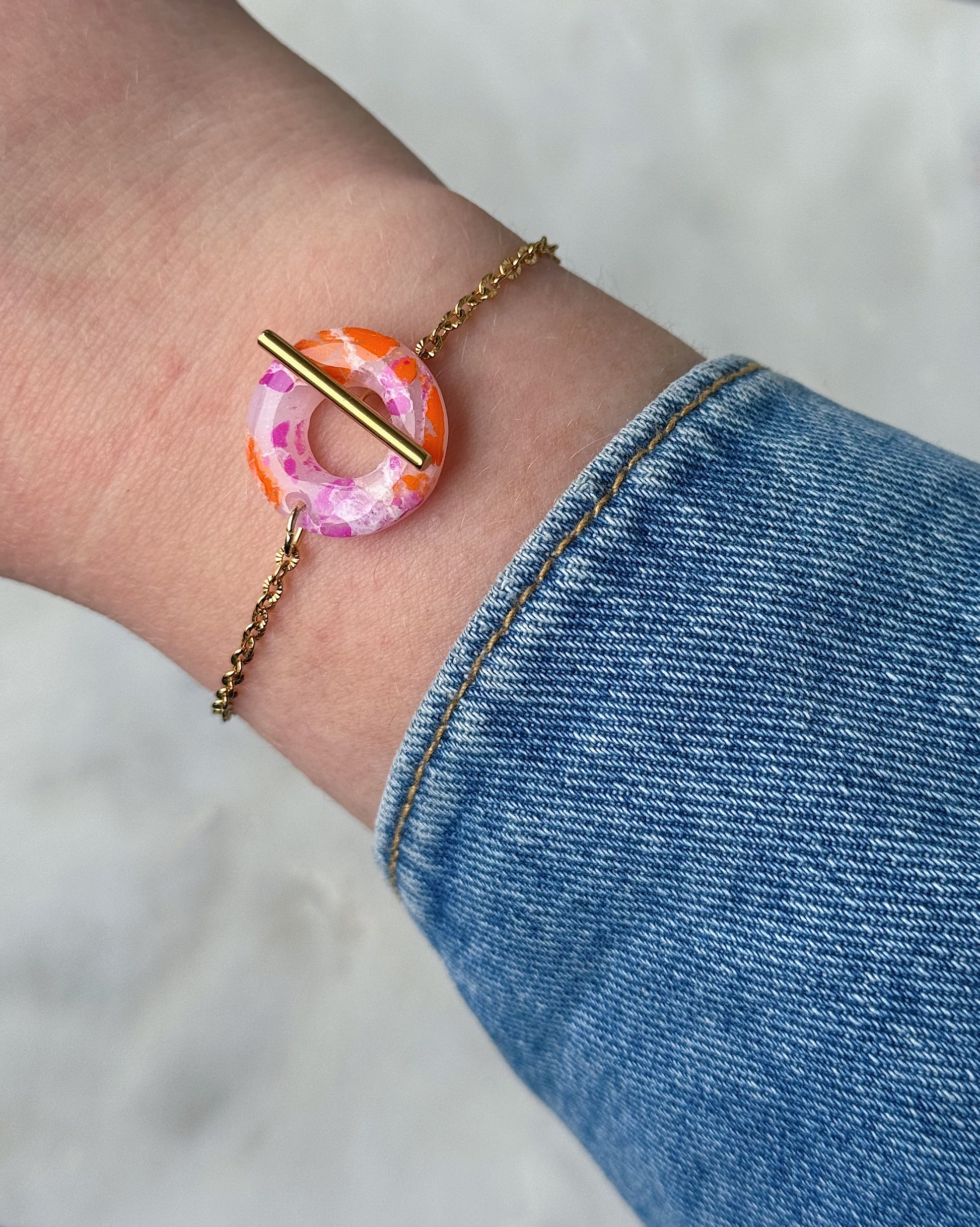 Kea on kauniin siro käsikoru, jonka kruunaa pyöreänmallinen, polymeerimassasta ja koruhartsista valmistettu rengasosa. Koru kiinnitetään salpalukolla rengasosan ympärille.