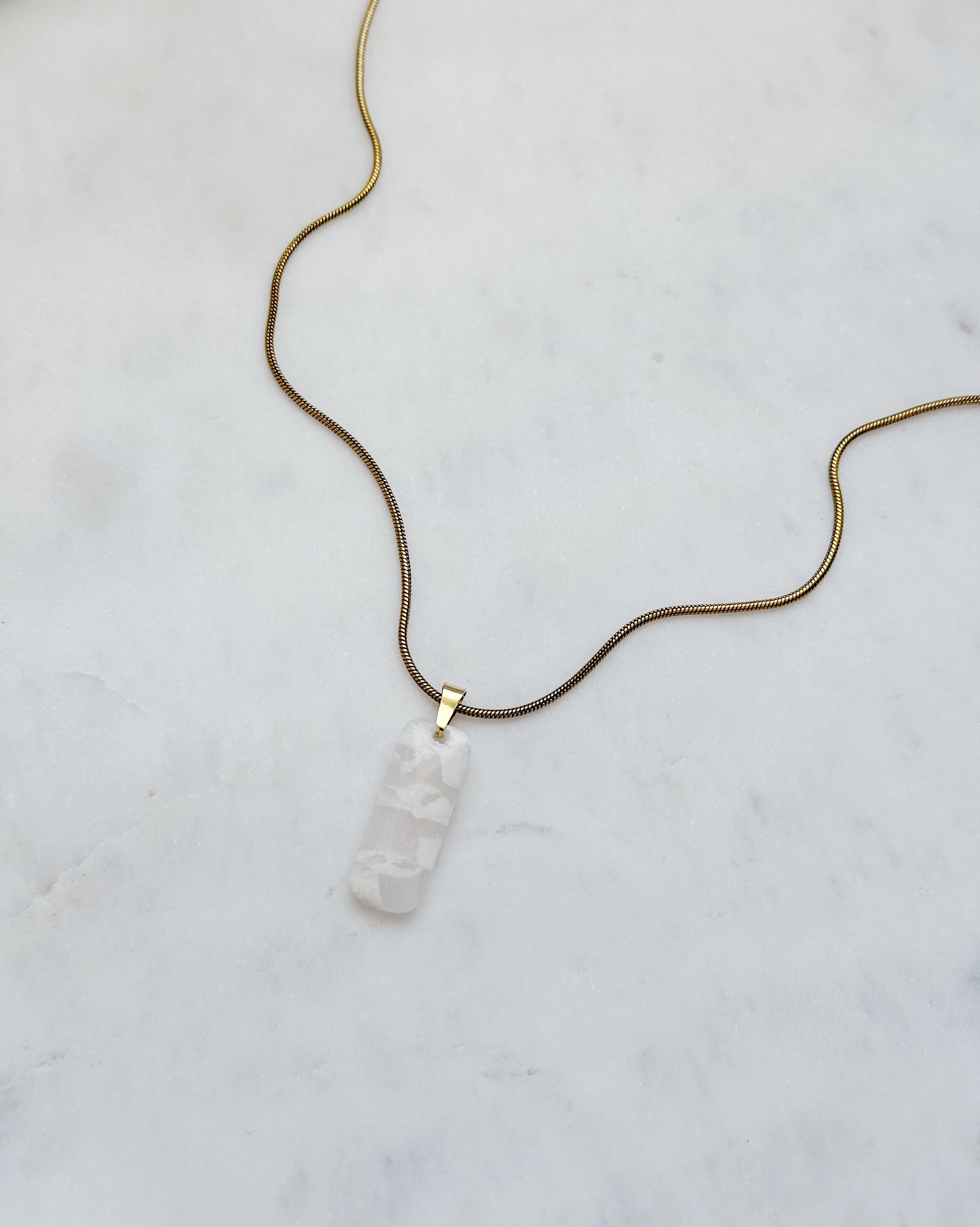 Korusta löytyvä, marmorikuvioinen riipusosa on valmistettu polymeerimassasta, joka on pinnoitettu hartsilla, luoden kiiltävän sekä kestävän pinnan riipukselle.